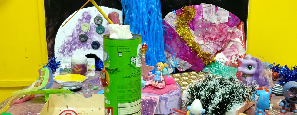 לכל קבוצת גיל הוקצה שולחן נפרד. היה מעניין מאוד לראות את האינטראקציות שנוצרו סביב השולחן - כיצד נעשות החלטות משותפות, מי מובילים בכל קבוצה, מי מעדיפים עבודה משותפת ומי יותר "סוליקו" - זה היה פשוט מרתק לראות! מעניין לא פחות וגם מרגש, יש לציין, היה לראות את הילדים.ות ממציאים דברים חדשים מדמיונם, יוצרים אותם מהחומרים השונים, חלקם ברורים ומובנים לזיהוי יותר וחלקם פחות. אבל החלק הבאמת מעניין הוא, שגם ההמצאות שלא נראו ברורות לי כאדם מבוגר, נראו כנראה לגמרי ברורות לילדים.ות, כי להם היה ברור שמה שהם רואים הם ארמון, וכתר, ומפלצת, ודרקון - גם אם הם הוכנו מקופסת קרטון צבועה בגואש ומקושטת בחרוזים. הם ראו באמת, הרגישו באמת, דמיינו על אמת והיו הכי אותנטיים עם עצמם. חלק הכי נהנו מהדבקה של גולות למשטח. חלק נהנו לשפוך נהרות של גואש על קופסאות קרטון ולכסות אותם בצבע. חלק נהנו מהחיטוט בחפצים וחלק נהנו לפזר נצנצים. למעשה, כולם נהנו לפזר נצנצים, כולל אני! :-)